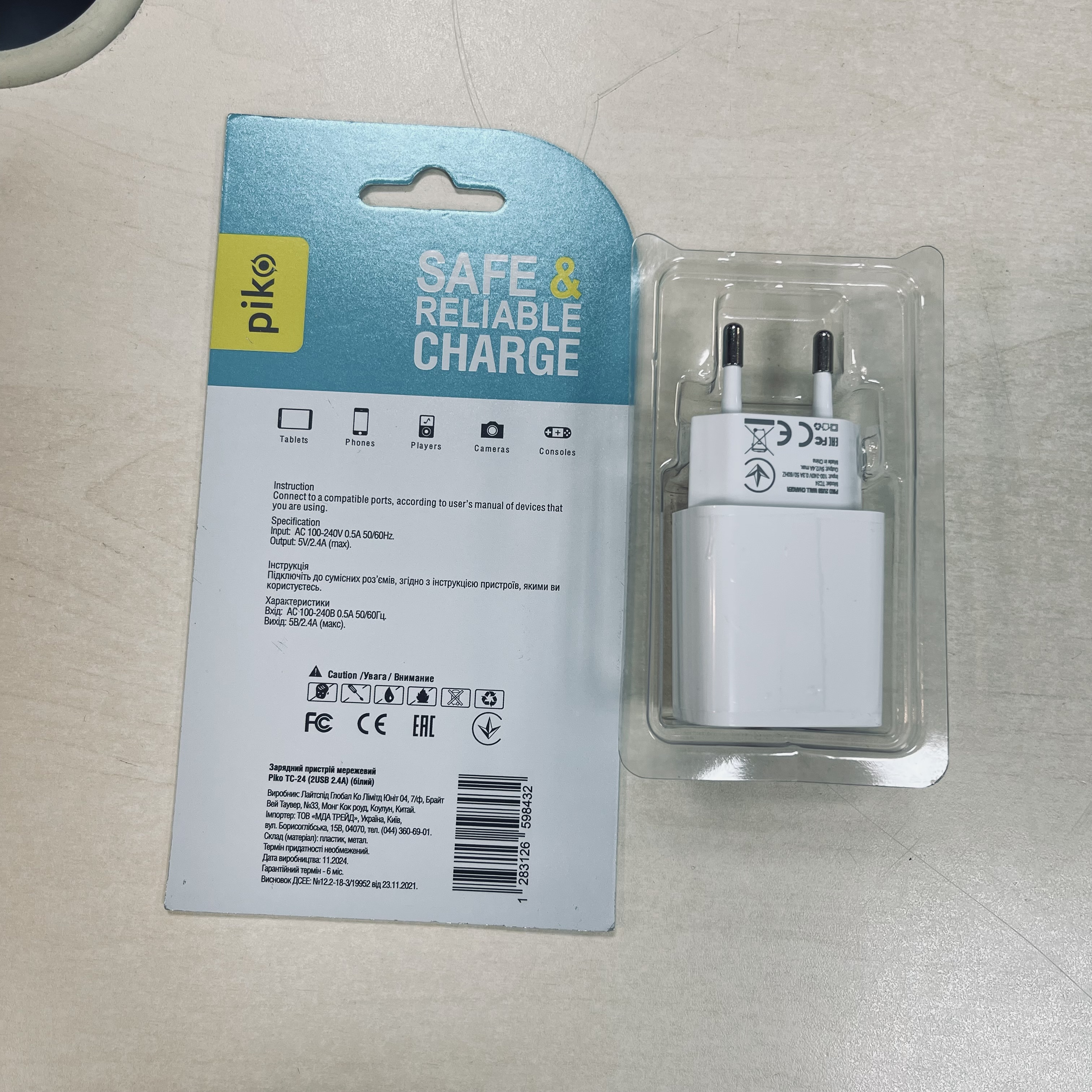 Зарядний пристрій мережевий Piko TC-24 (2USB 2.4A) (білий), виробник: Лайтспід Глобал Ко Лімітд Юніт 04,7/ф, Брайт Таувер, №33, Монг Кок роуд, Коулун, Китай; імпортер: ТОВ «МДА Трейд», Україна, Київ, вул. Борисоглібська, 15 В, 04070, тел. (044) 360-69-01; склад (матеріал): пластик, метал, термін придатності не обмежений.