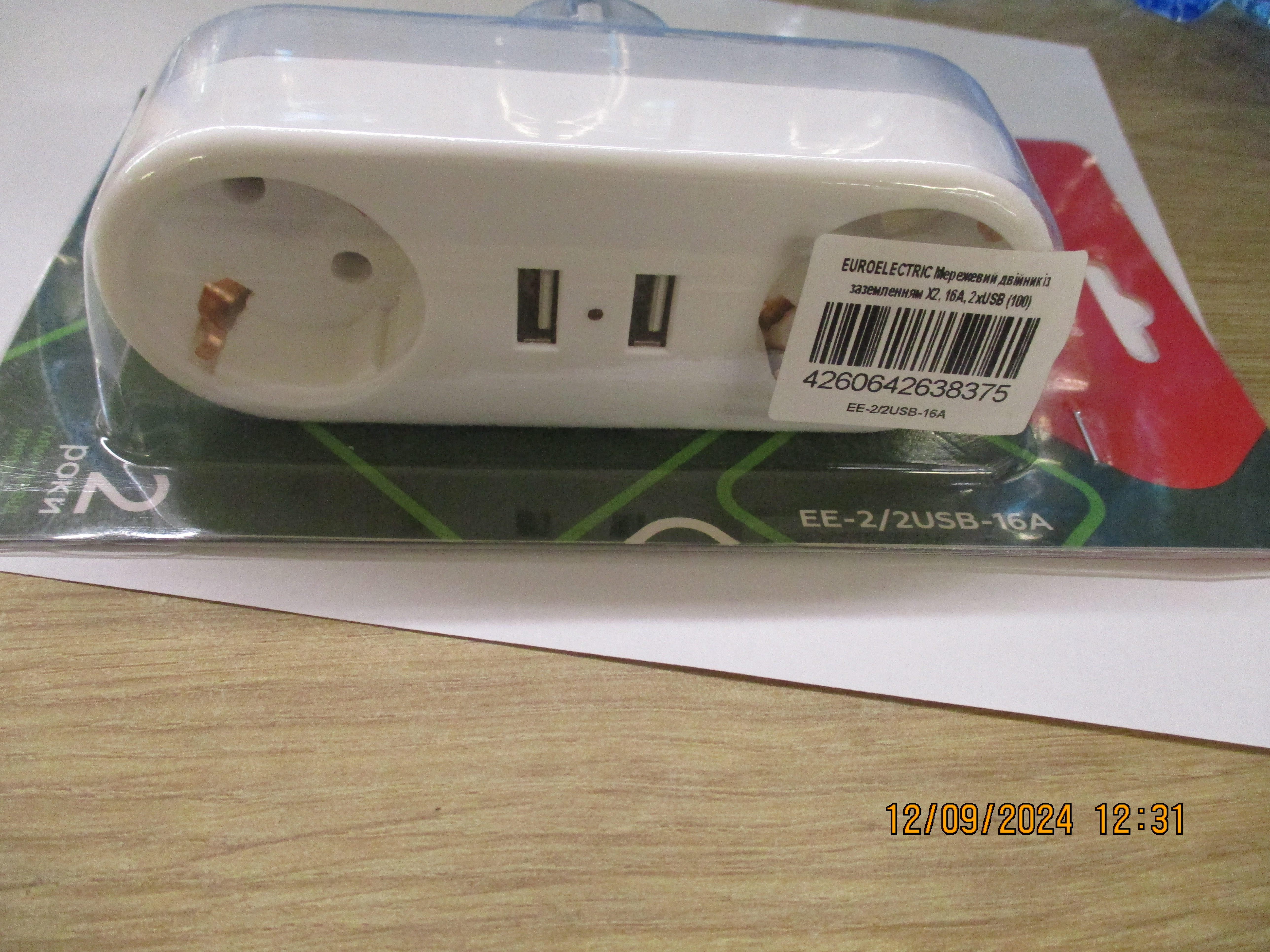 Двійник електричний ТМ EUROELECTRIC, 16А, арт. ЕЕ-2/2USB-16A, 2 розетки, АС 220-240 V, 3500 W, 5V/2.1А, штрих код: 4260642638375. Виробник: Грін Пауер Євроелектрик ГмбХ, Німеччина, Берлін 12099 Рінгбанштрассе, 10-14. Імпортер: ТОВ «ГАСТРО НОМ», Бориспільське шосе, 41 В, м. Київ, 02121